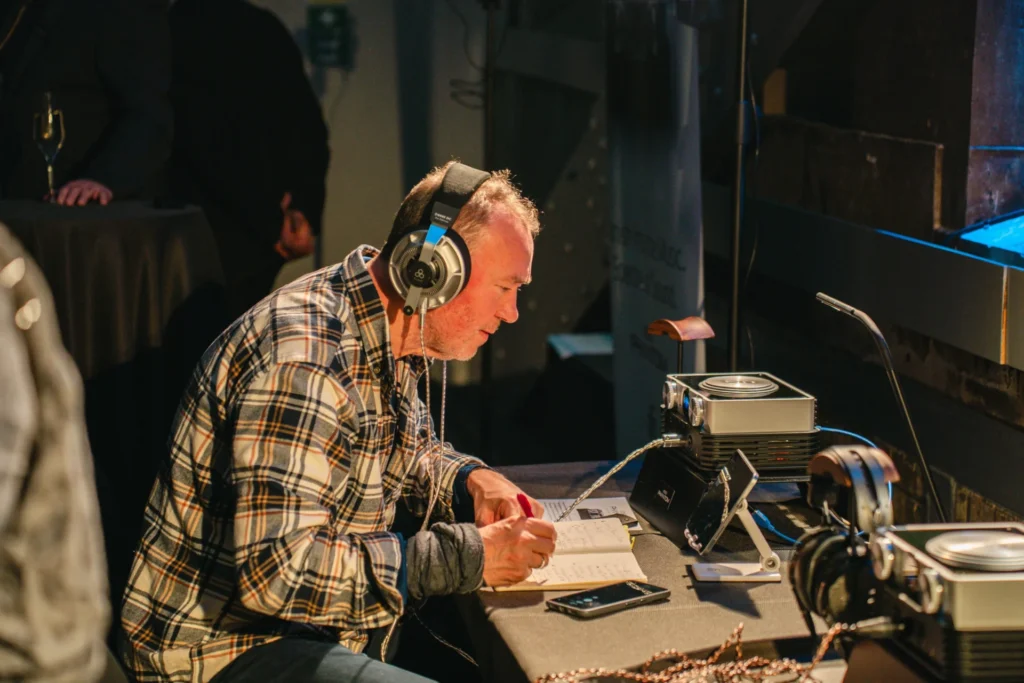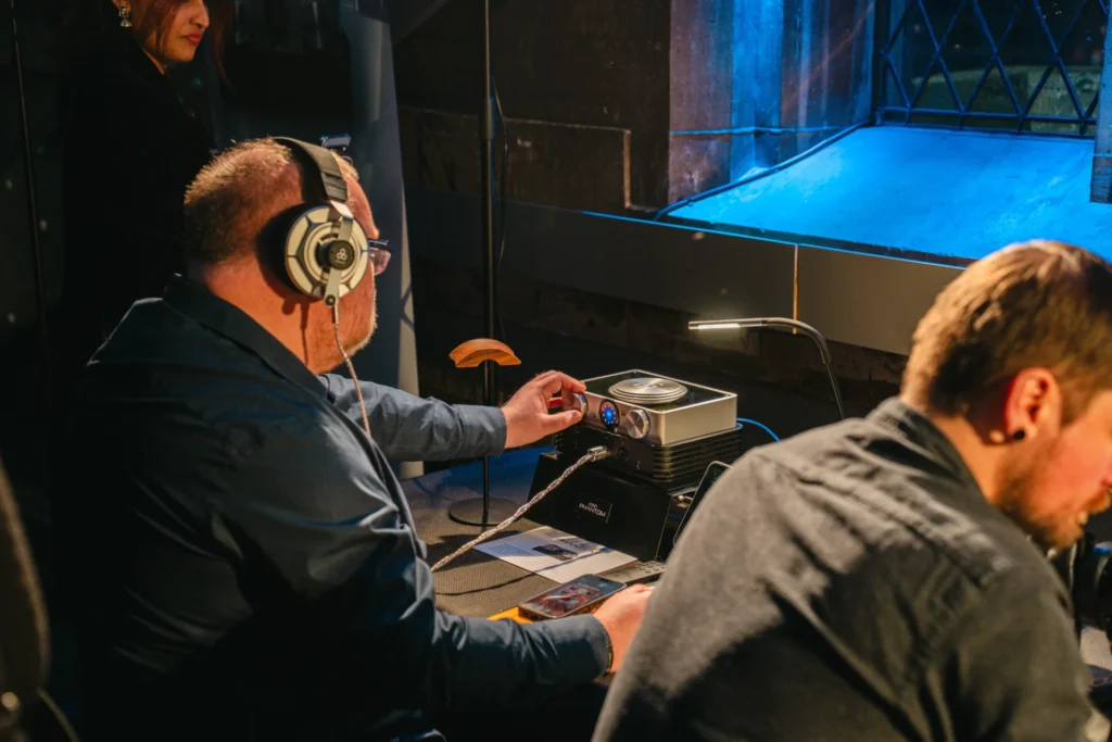 Então veio o momento mais aguardado da noite. Com o tráfego da Tower Bridge fluindo logo abaixo e o Tâmisa se estendendo além das janelas, quatro estações de audição do iDSD PHANTOM foram reveladas, convidando os presentes a explorar o equipamento no próprio ritmo e experimentar suas capacidades em primeira mão.